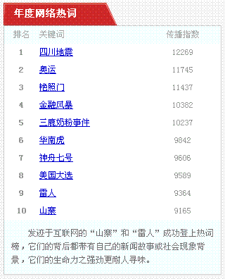 年度網(wǎng)絡(luò)熱詞排行榜中,“四川地震”、“奧運”和“艷照門”成為2008年網(wǎng)友最關(guān)注的三大事件,分列該榜單前三甲。而發(fā)跡于互聯(lián)網(wǎng)的“山寨”和“雷”也成功入選年度十大網(wǎng)絡(luò)熱詞,與以往網(wǎng)絡(luò)流行詞所不同,它們的背后都帶有自己的新聞故事或社會現(xiàn)象背景,生命力之強(qiáng)勁更耐人尋味。