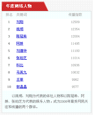 受到北京舉辦奧運會的影響和“艷照門”事件的炒作,以姚明、劉翔為代表的體壇人物和以陳冠希、阿嬌、張柏芝為代表的娛樂人物,成為最受關(guān)注和傳播的兩類公眾人物??票?、貝克漢姆和菲爾普斯為十份榜單中僅有的三名外籍人士,科比還同時入選年度網(wǎng)絡(luò)人物和年度體壇人物的十強(qiáng)。在年度企業(yè)家榜單中,以王石、黃光裕、牛根生等為代表的爭議性人物和以丁磊、馬云為代表的商業(yè)模式英雄,成為最受關(guān)注和傳播的兩類企業(yè)家。