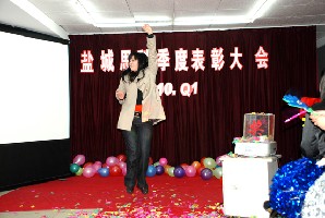 優(yōu)秀商務(wù)經(jīng)理陳劉珍接受陳總的頒獎,并與伙伴們交流成功心得,堅持不懈才是王道
